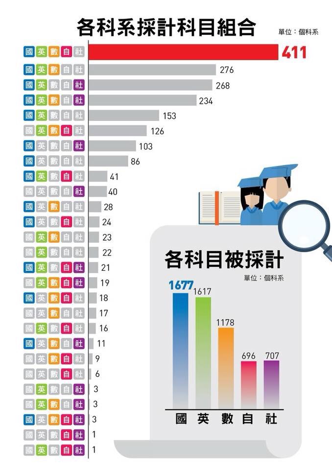 個人申請使用3科系組合最多,國文、英文最多大學使用,
