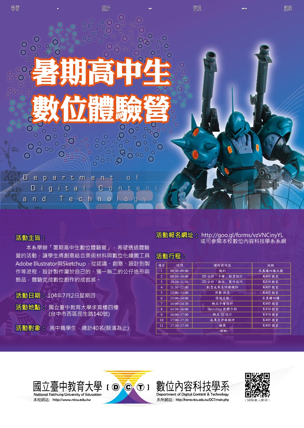 | 2015/06/08 臺中教育大學辦理「暑期高中生數位體驗營」,請踴躍報名參加。 |