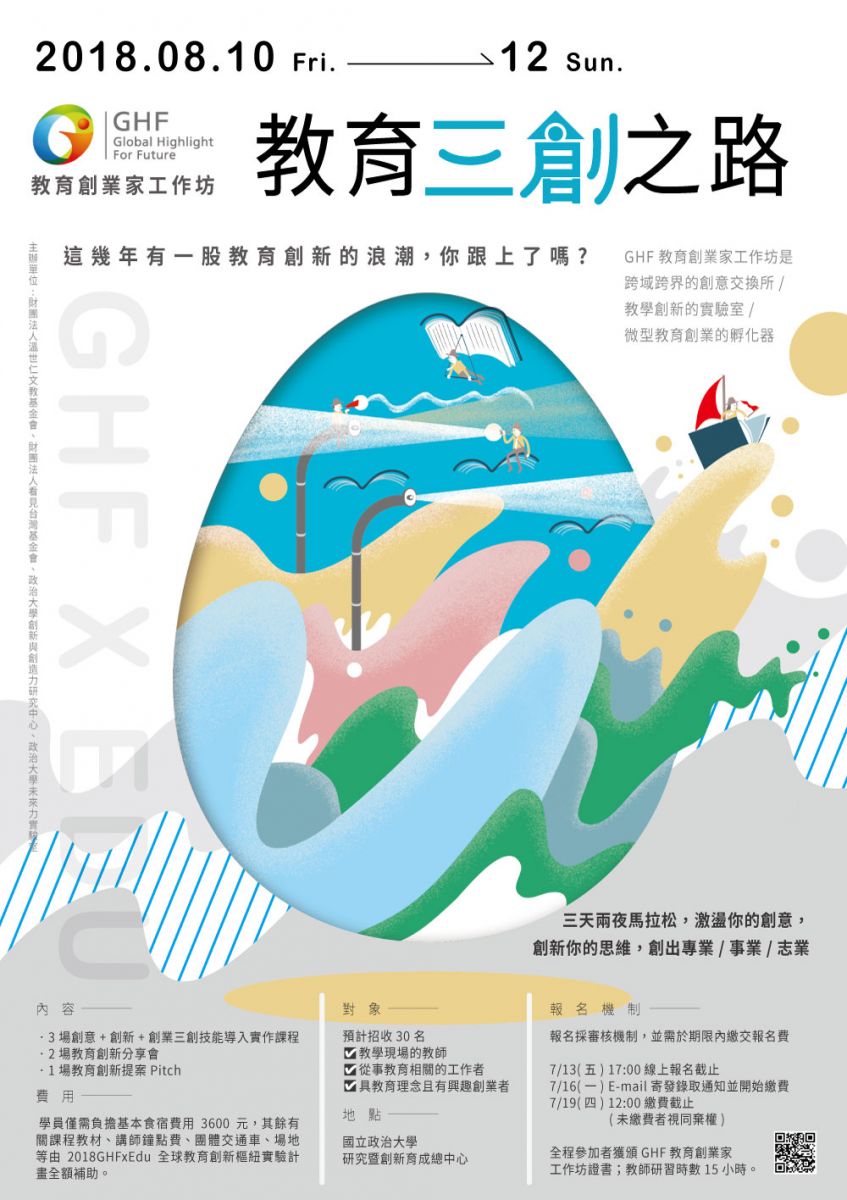 政治大學辦理「GHF教育創業家工作坊-教育三創之路」活動,報名資訊詳附件公文。