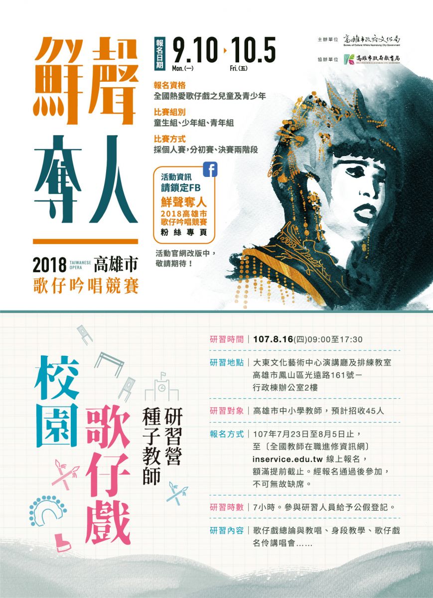 「鮮聲奪人-2018高雄市第二屆歌仔吟唱競賽」暨「校園歌仔戲-種子教師研習營」活動,報名資訊詳附件。