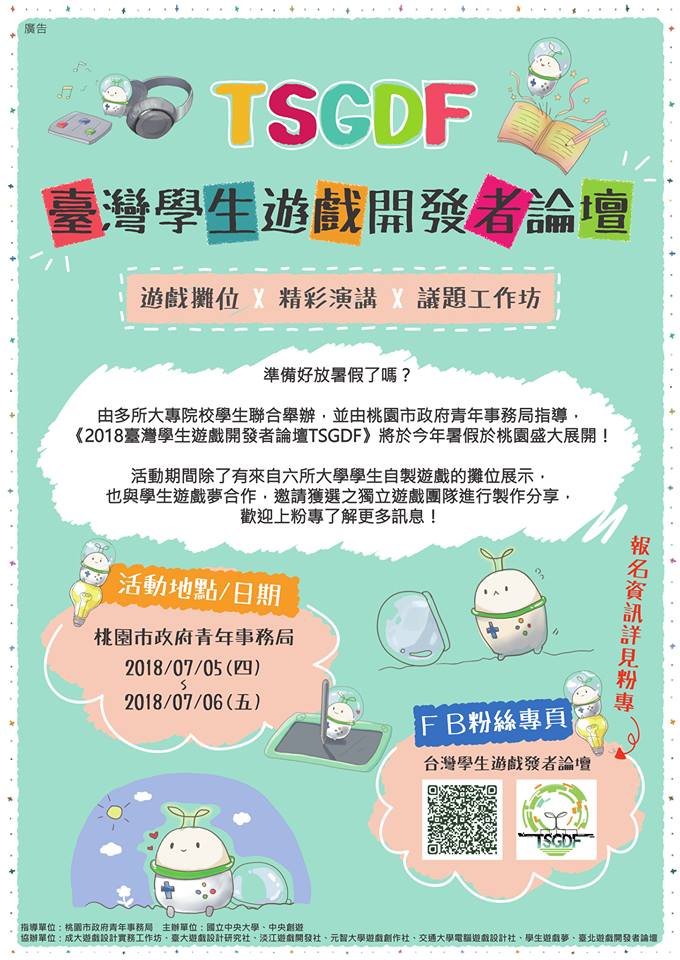 一、由中央大學學生創立的遊戲創作交流學生社群「中央創遊」宣布,將發起主辦以學生遊戲開發者交流互動為主題的首屆「臺灣學生遊戲開發者論壇(TSGDF)」,預定 7 月5 日(四)至 7 月 6 日(五)在桃園市政府青年事務局舉辦,採事前報名制,即日起至 6 月 30 日開放報名。