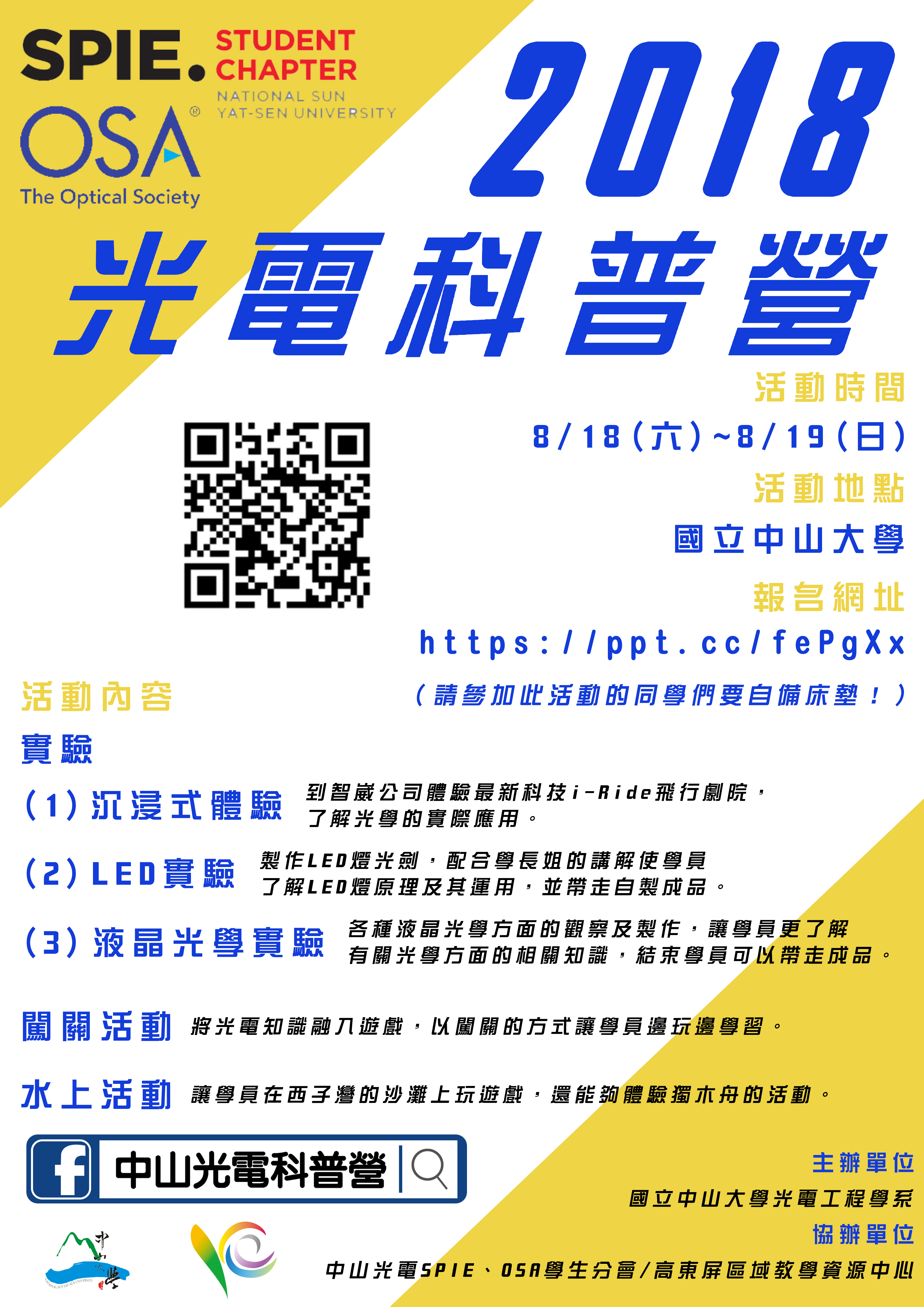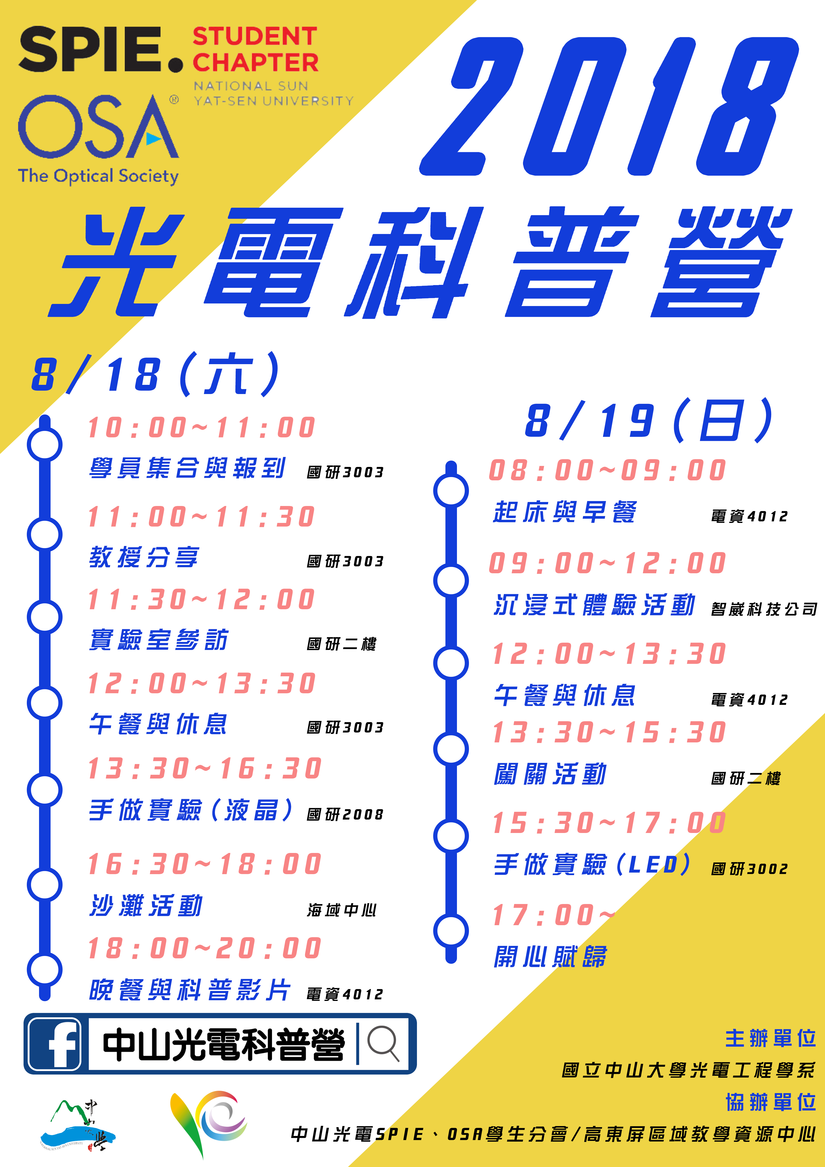 一、為推廣光電與科學知識,增進學生認知及激發學習動機,中山大學訂於107年8月18至20日假本校國際研究大樓辦理「暑期光電科普營」。