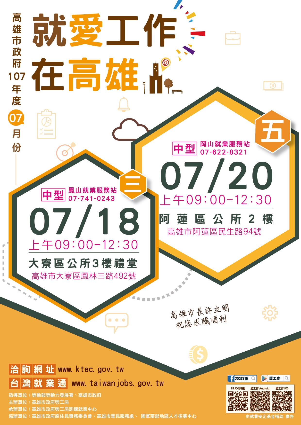 | 2018/07/02 勞工局訓練就業中心訂於7月18日於大寮區公所、7月20日於阿蓮區公所,辦理2場次中型現場徵才活動。歡迎有求職需求的市民朋友們,踴躍前往參加,詳細活動訊息請至訓就中心網頁查詢或洽各就業服務站 |