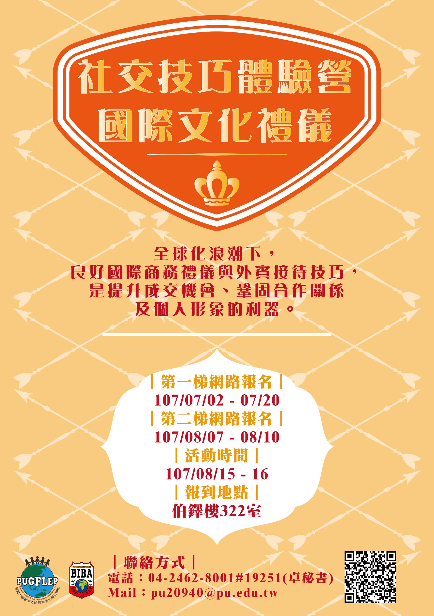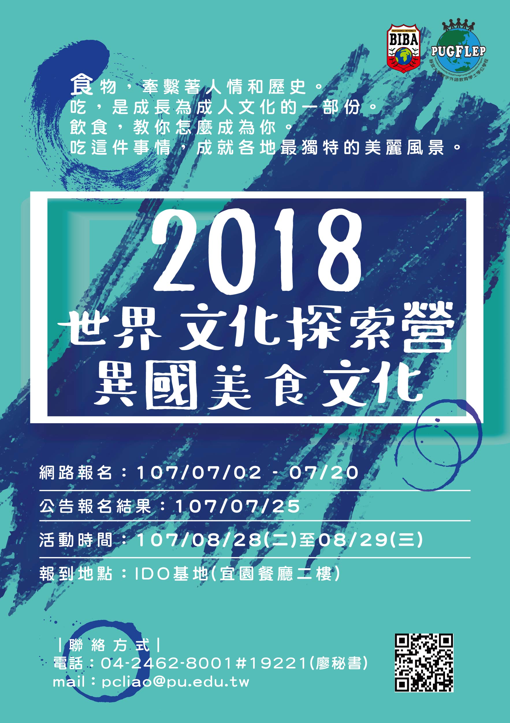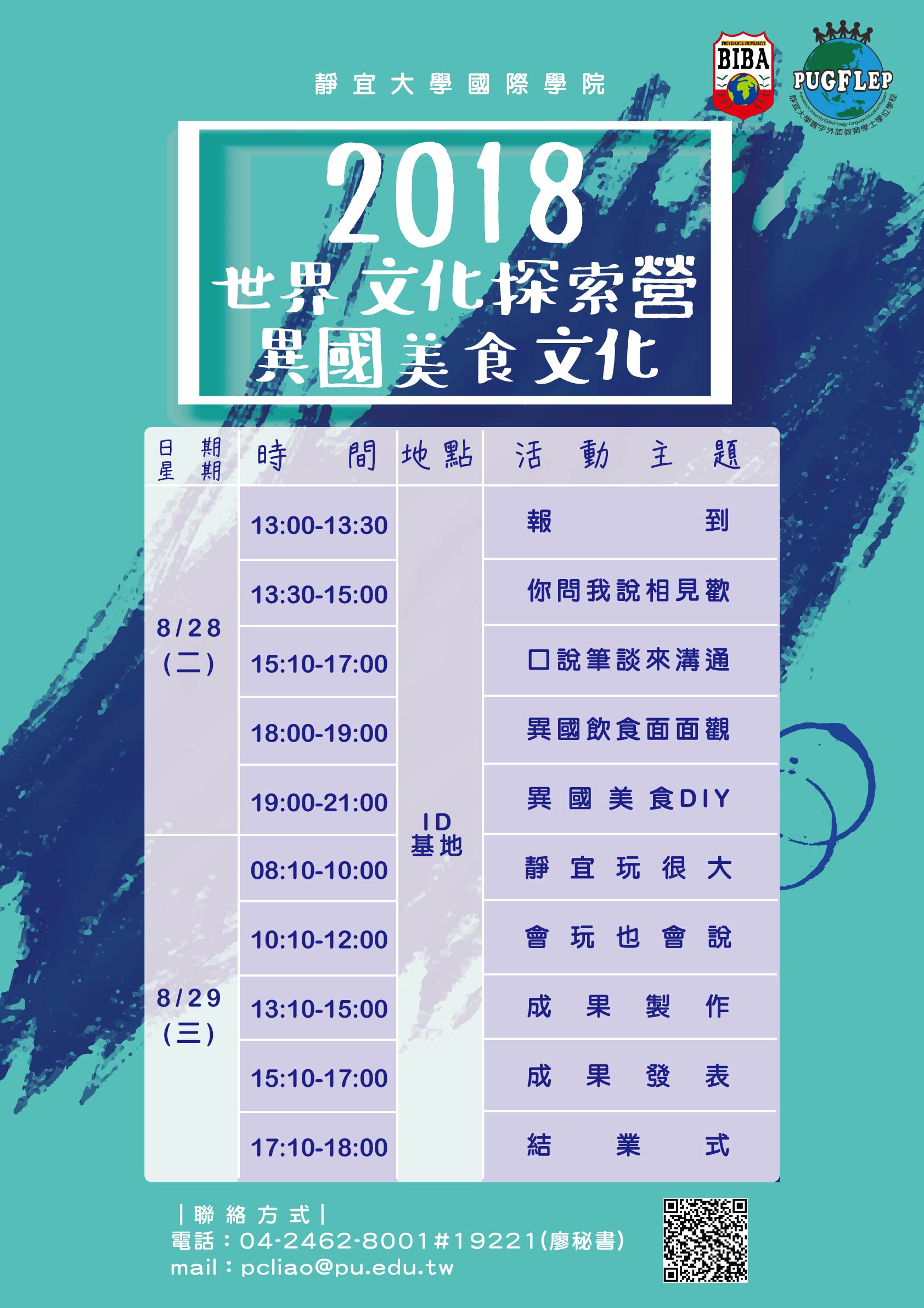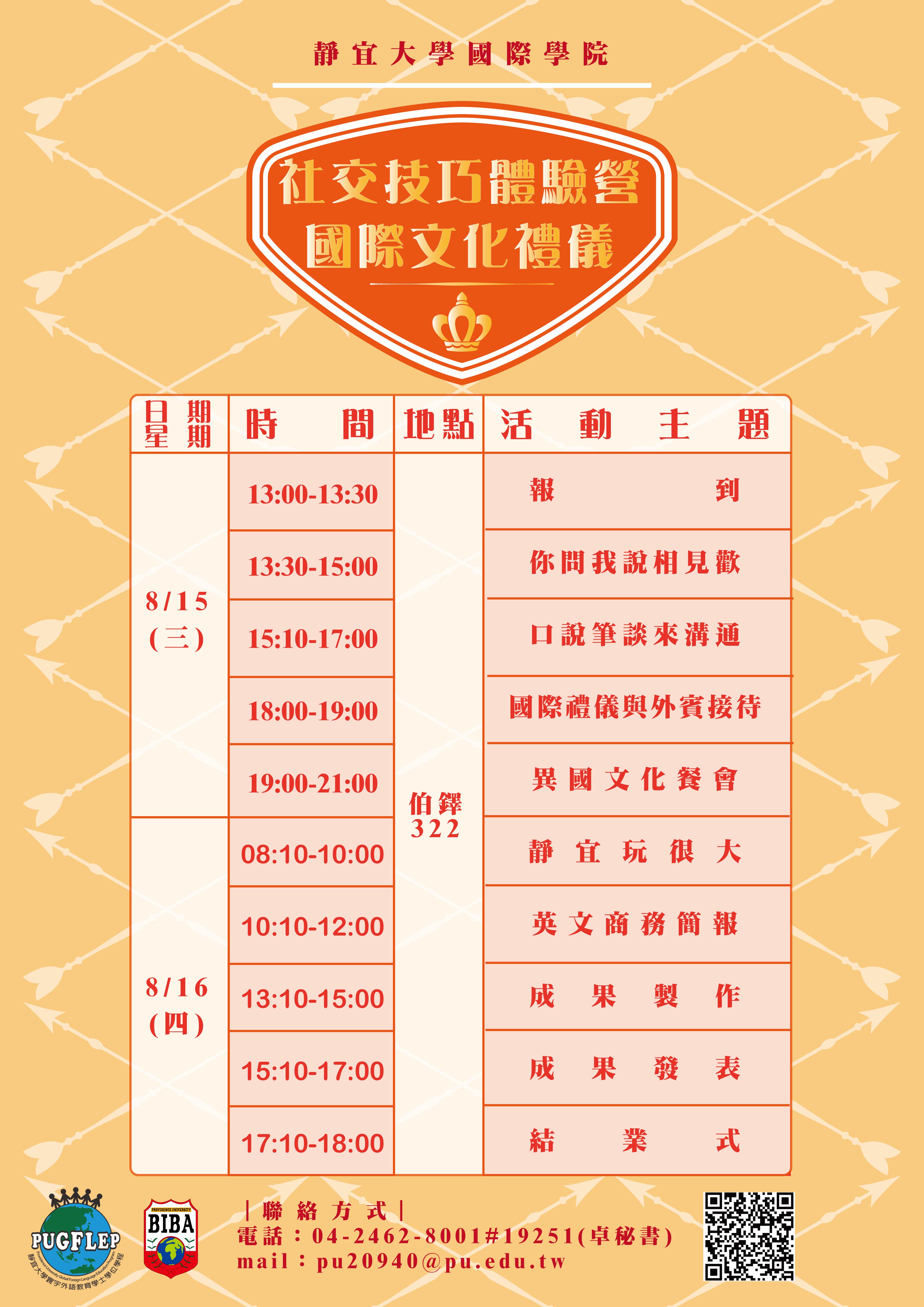 一、營隊主題:107年8月15、16日為社交技巧體驗營-國際文化禮儀、107年8月28、29日為2018世界文化探索營-異國美食文化。