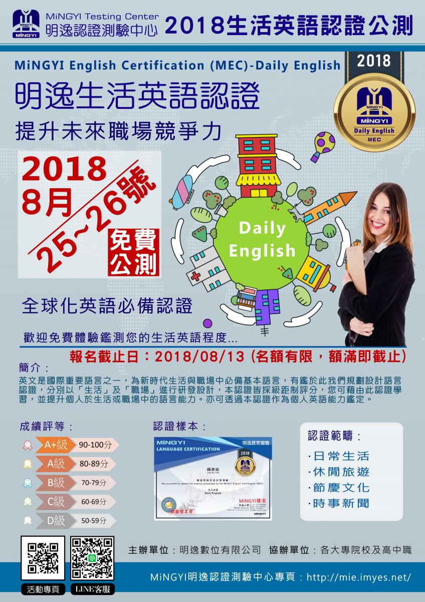 (一) 英文是國際重要語言之一,為新時代生活與職場中必備基本語言,有鑑於此,明逸數位有限公司規劃設計語言認證,分別以「生活」及「職場」進行研發設計,本認證皆採級距制評分,您可藉由此認證學習,並提升個人於生活或職場中的語言能力。亦可透過本認證作為個人英語能力鑑定。