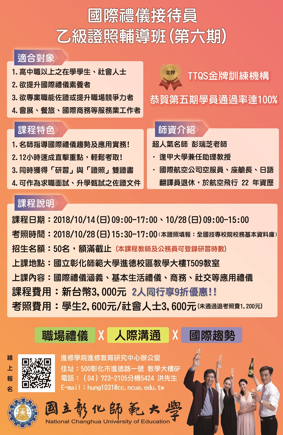 | 2018/07/25 彰化師範大學第六期國際禮儀接待員乙級證照輔導班 |