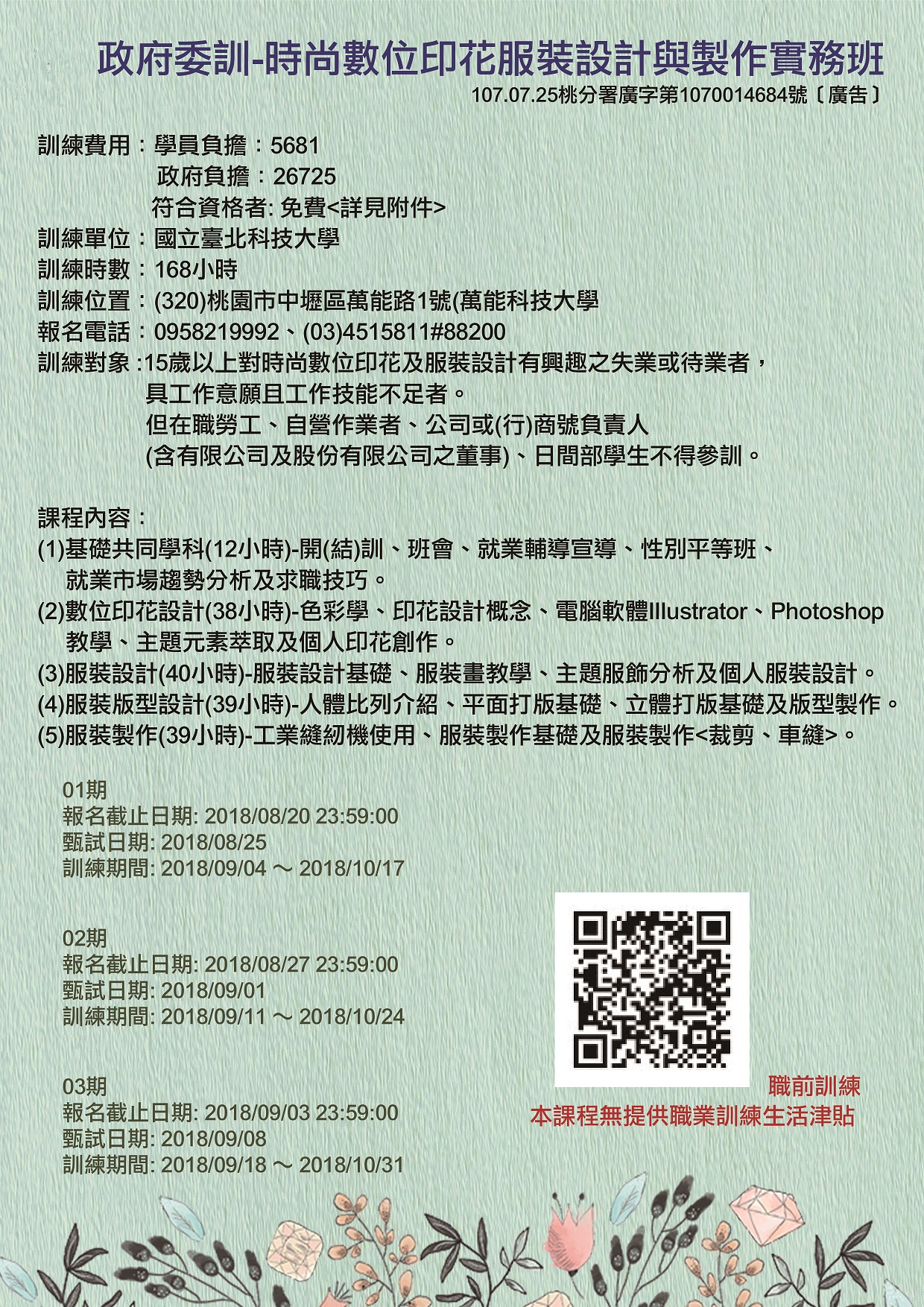 | 2018/08/29 時尚數位印花-服裝設計與製作實務班01-03期 |