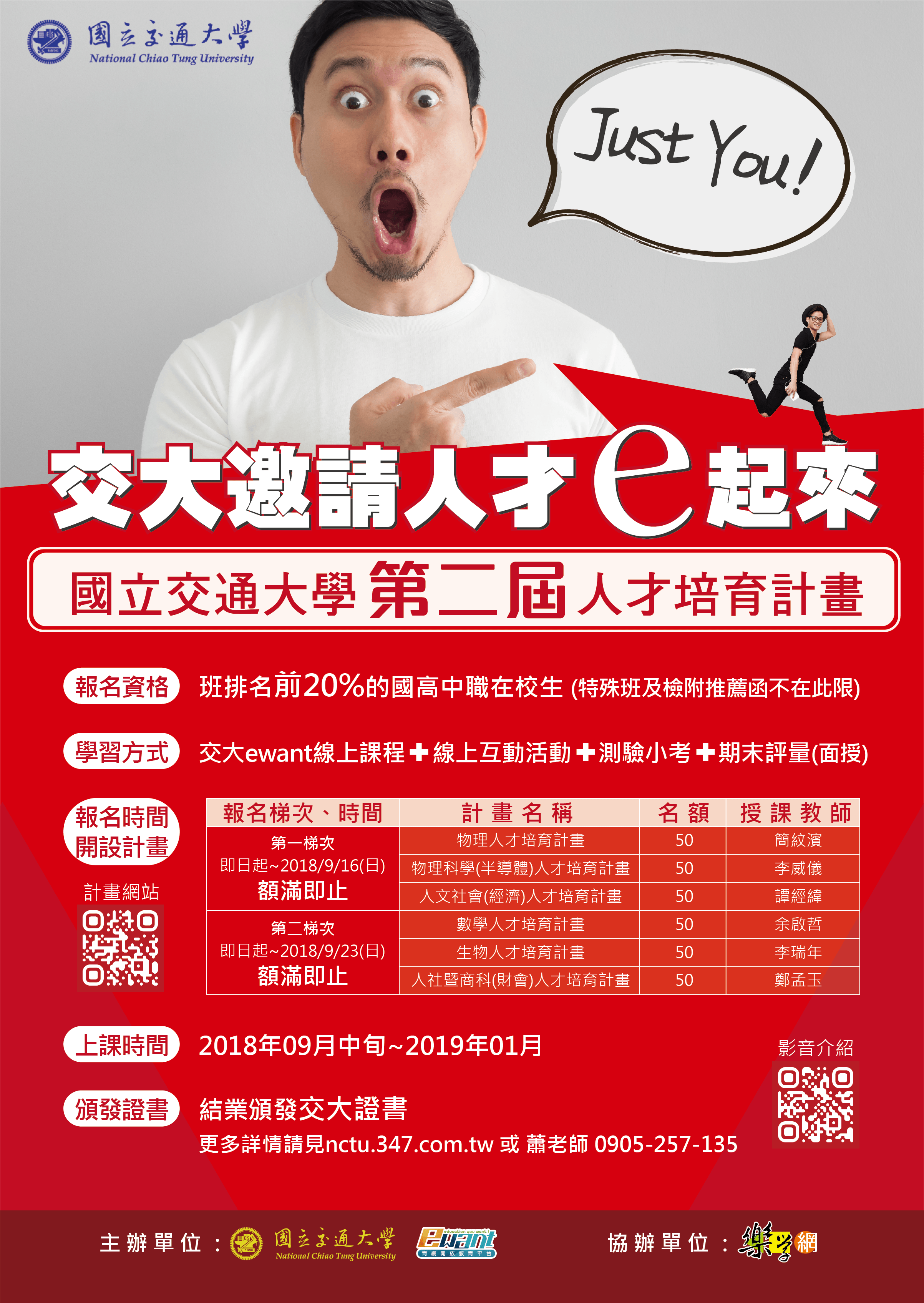 說明:為推動台灣共享教育理念,攜手高中線上學習,整合大學磨課師課程,由本校ewant育網平台與樂學網合作執行第2期國立交通大學中學人才培育計畫。