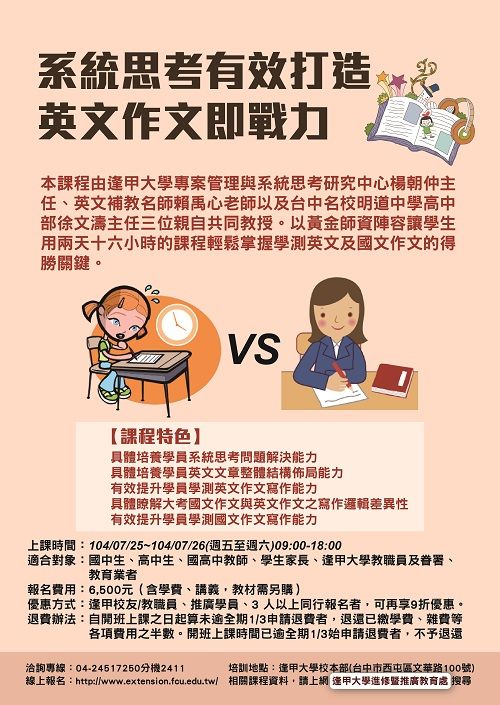 | 2015/06/12 逢甲大學舉辦103學年度暑假「系統思考有效打造英文作文即戰力」課程 |