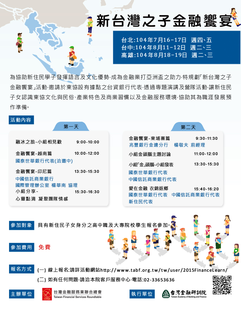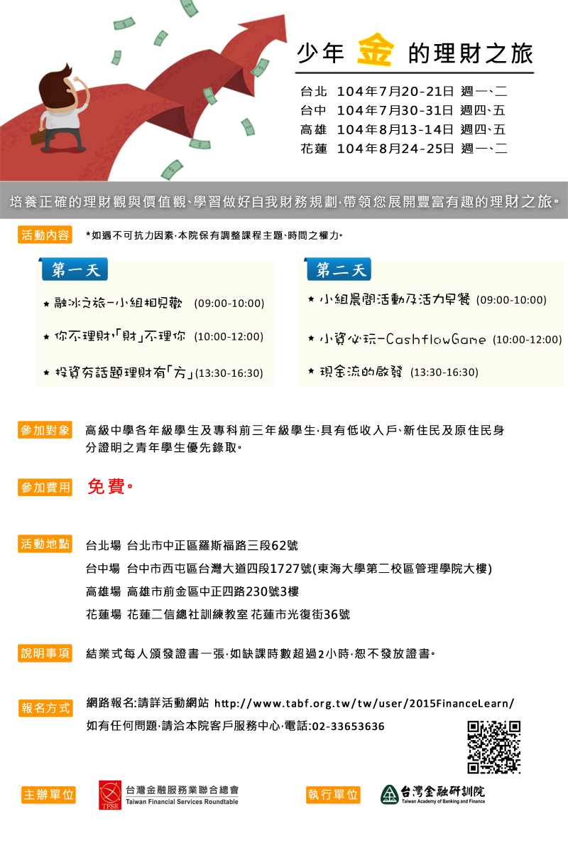 | 2015/06/12 台灣金融研訓院辦理「2015年金融知識樂學習計畫」活動,請踴躍參加。 |