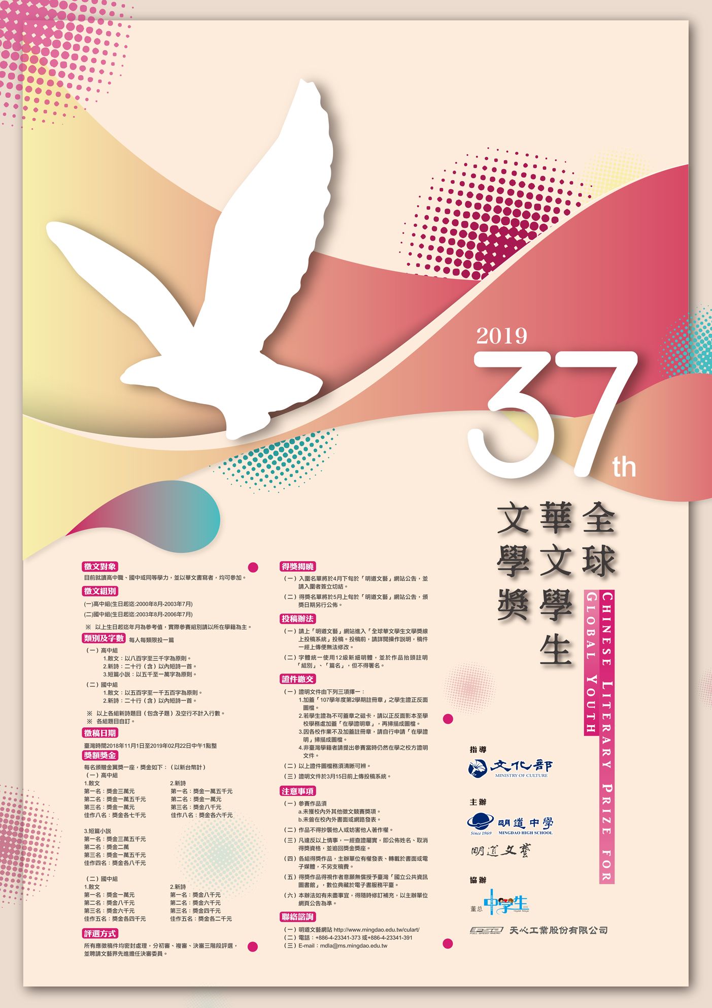 | 2018/11/13 轉知臺中市私立明道高級中學文化創意處舉辦「第37屆全球華文學生文學獎」競賽 |