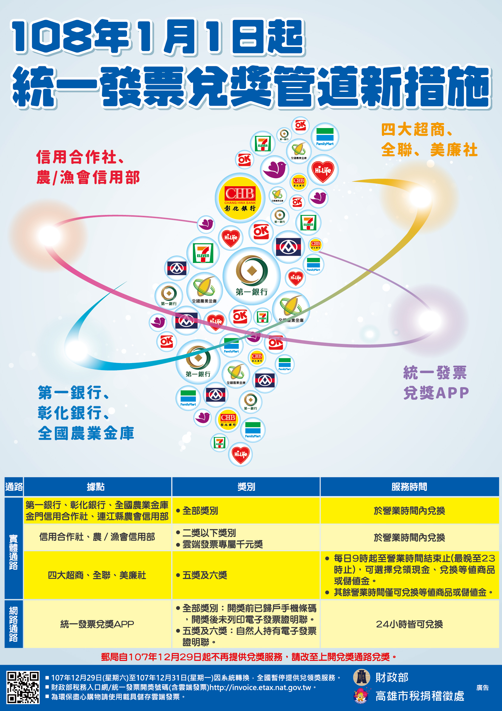 一、郵局自107年12月29日(星期六)起,不再提供統一發票兌獎服務,108年1月1日起改至下列兌獎通路兌獎: