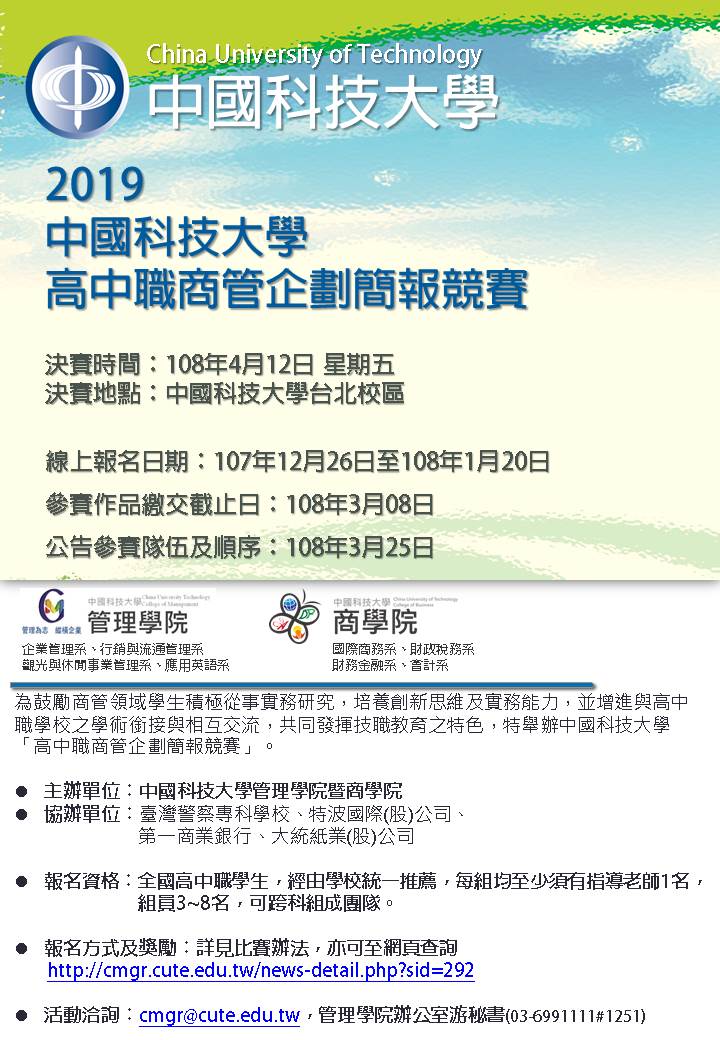 (四)競賽辦法、賽程請詳見附件或至商學院網頁查詢(http://cmgr.cute.edu.tw/news-detail.php?sid=292)。