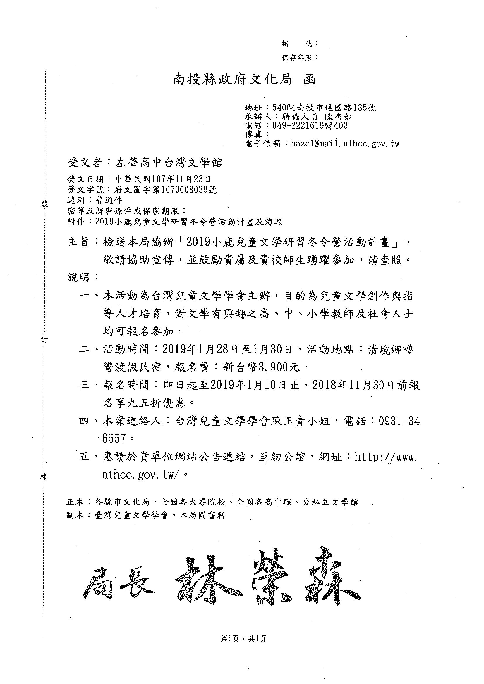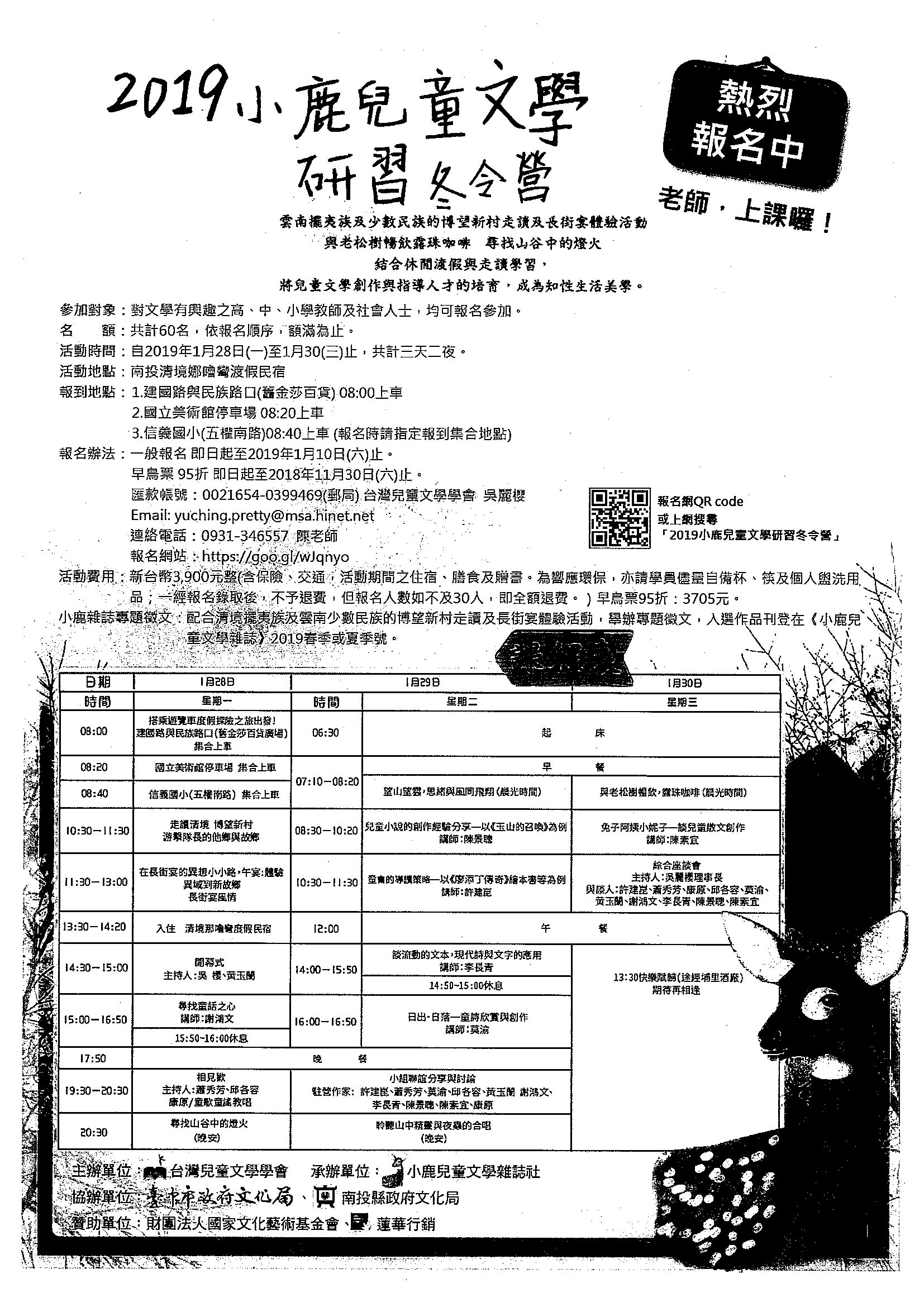 | 2018/11/29 轉知南投縣政府文化局協辦「2019小鹿兒童文學研習冬令營活動計畫」 |