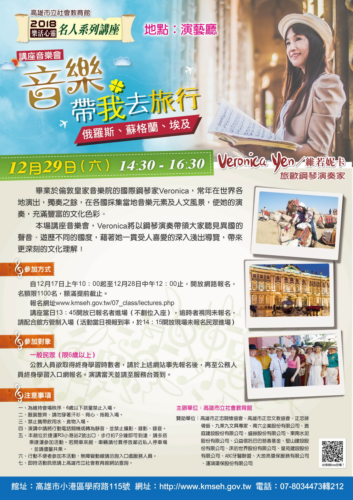 | 2018/12/03 「音樂帶我去旅行:俄羅斯、蘇格蘭、埃及」講座音樂會與「現實與浪漫廝殺的電影夢」講座 |
