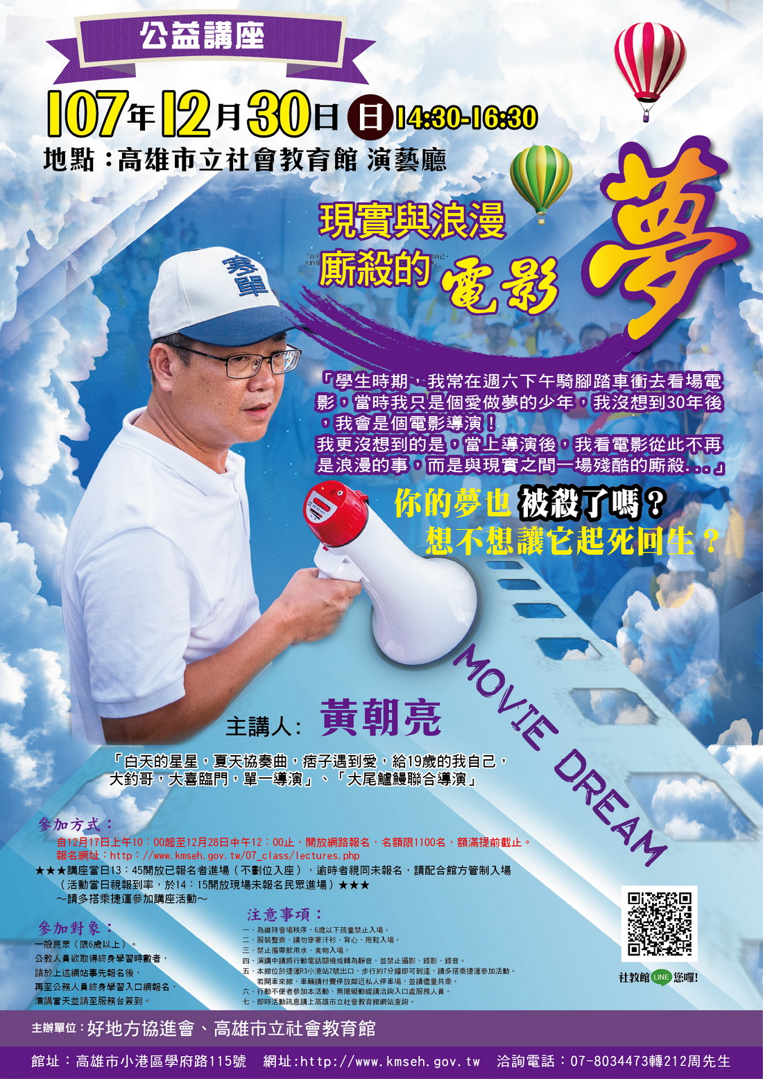 2、主講人:黃朝亮<白天的星星、夏天協奏曲、痞子遇到愛、給19歲的我自己、大釣哥、大囍臨門、大尾鱸鰻等電影導演>。