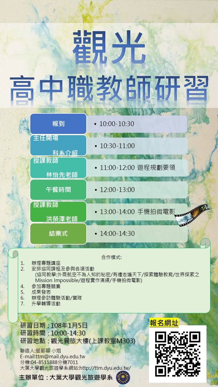 | 2018/12/20 大葉大學觀光旅遊學系辦理「高中職教師研習」訊息 |