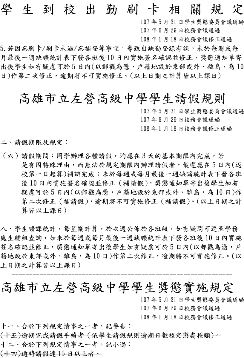 | 2019/01/22 關於本校學生到校未刷卡或刷卡失敗及請假逾期(五日內未完成請假程序)懲處修正一案,已於108.01.18校務會議修正通過。 |
