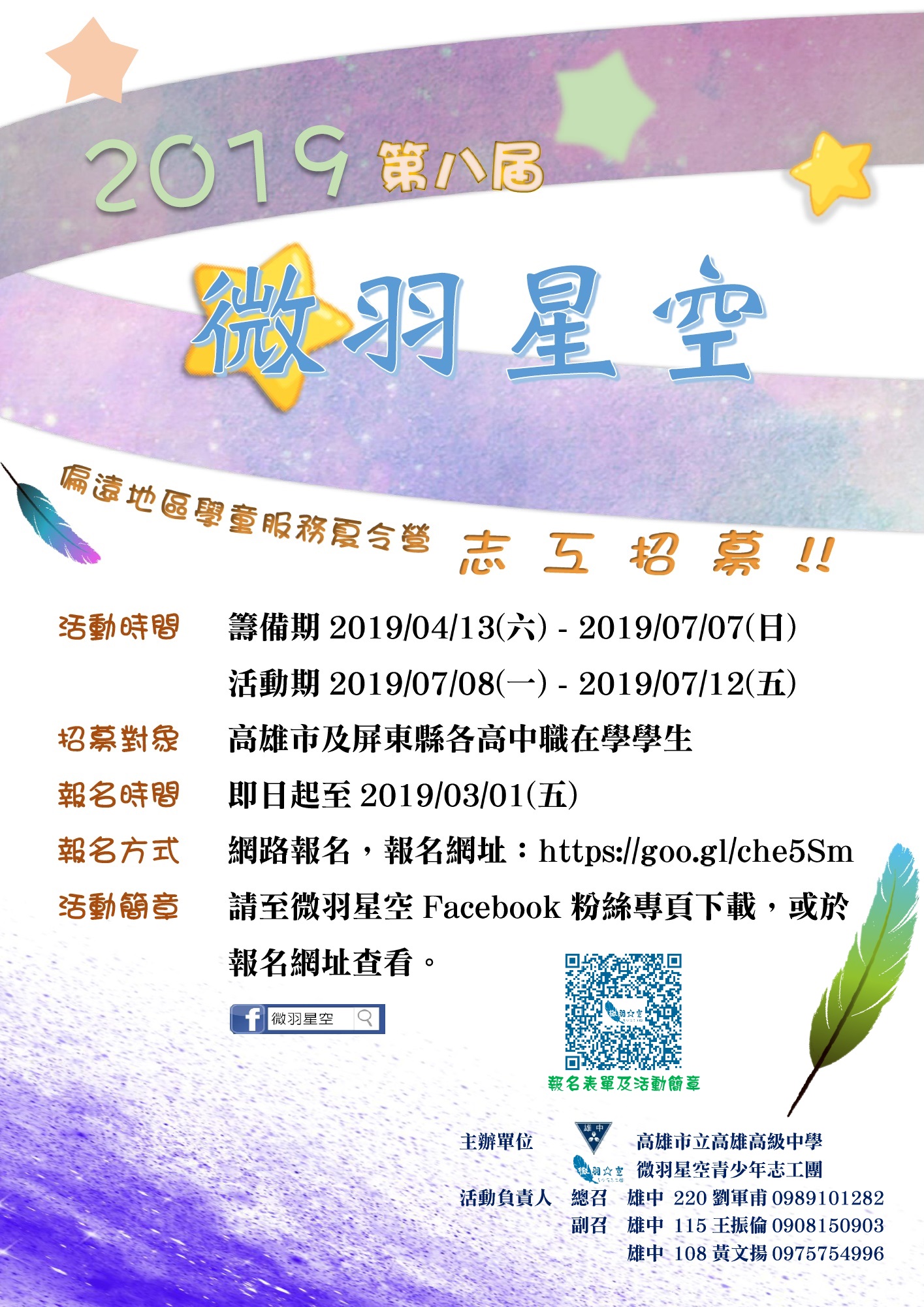 一、微羽星空服務團將於108年7月08-12日(週一至週五)於高雄市大社區國小(暫定)辦理學生暑期育樂營。