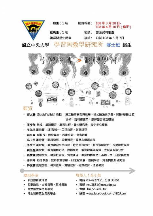 | 2019/03/20 國立中央大學學習與教學研究所108學年博士班入學考試招生 |