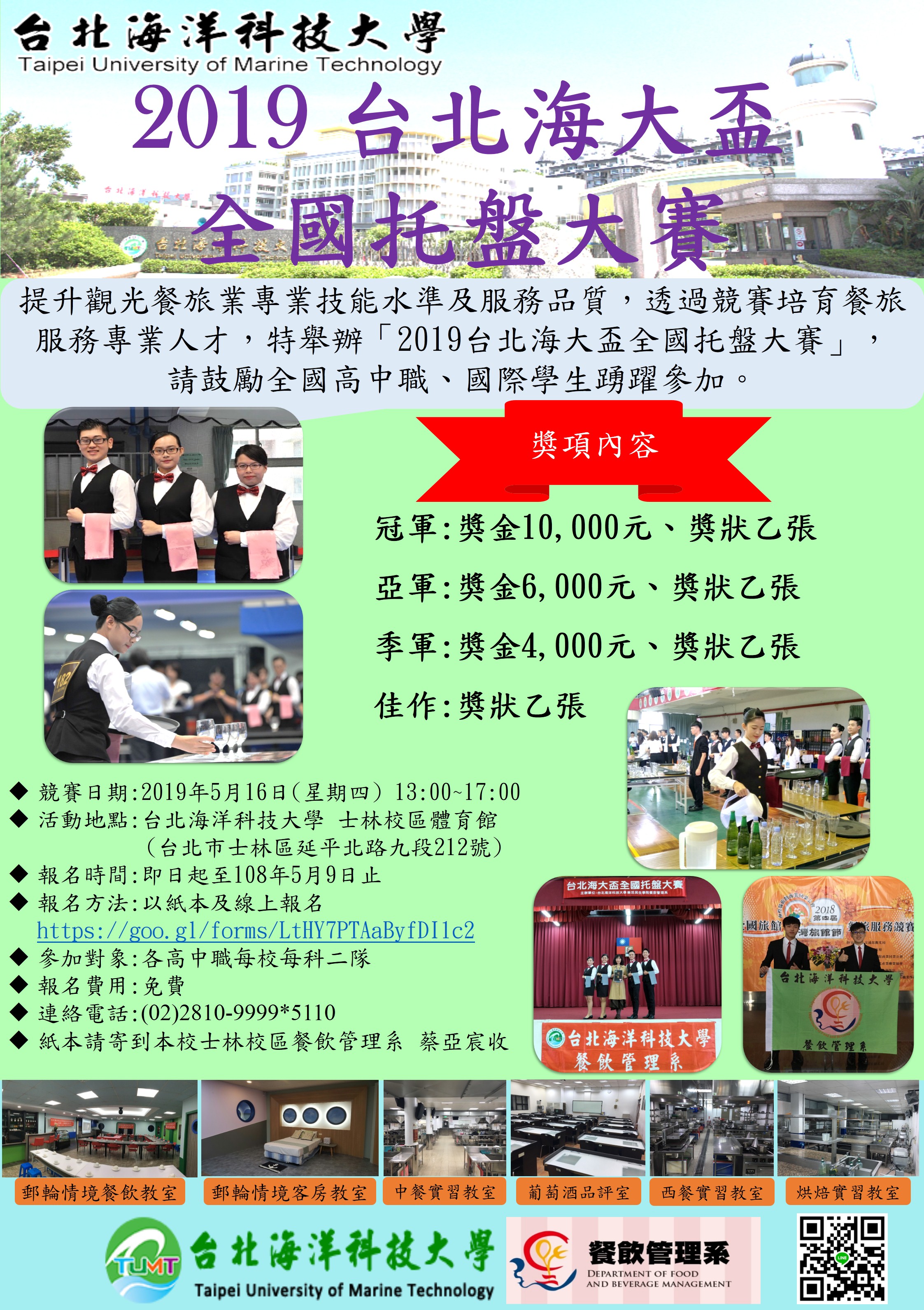 三、報名方式:以網路報名時間為優先序,報名網址如下:「https://goo.gl/forms/LtHY7PTAaByfDI1c2」並列印出報名表郵寄至11174台北市士林區延平北路九段212號,餐 飲管理系蔡亞宸收。