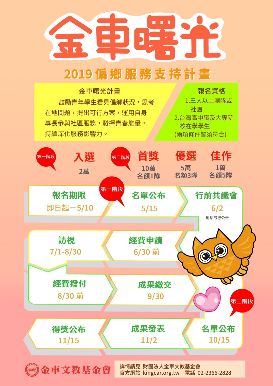 一、活動詳情請參閱附件或至金車文教基金會官網»社會公益»青年志工網頁查詢。