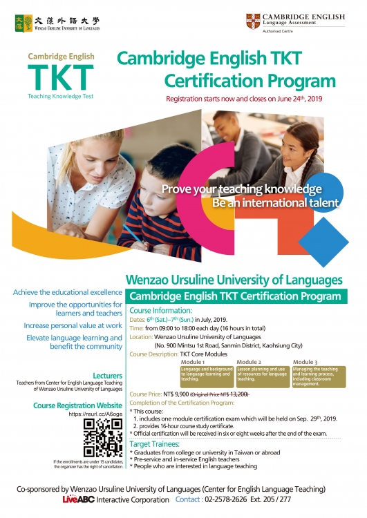 | 2019/05/03 文藻學校財團法人文藻外語大學英語教學中心7月開辦「Cambridge English TKT英語教學師資認證班」暑期培訓招生 |