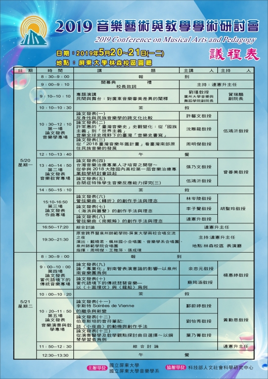 | 2019/05/06 國立屏東大學音樂學系謹訂於2019年5月20日至21日(星期一、星期二)辦理「2019音樂藝術與教學學術研討會」 |