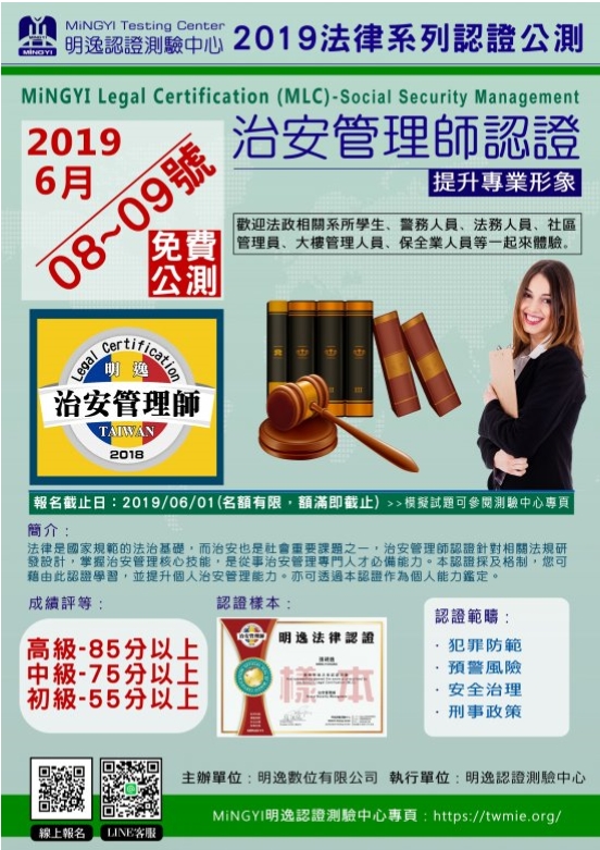 明逸數位有限公司認證測驗中心舉辦2019 MiNGYI 明逸「治安管理師認證」公測活動,歡迎師生免費報名體驗考,詳如說明。