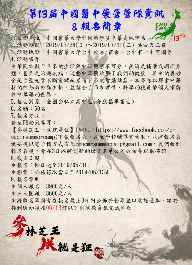 五、報名方式:請至https://www.facebook.com/cmucmrsummercamp下載報名表,
