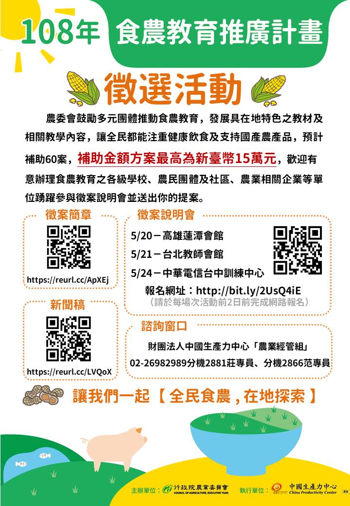 | 2019/05/17 轉知行政院農業委員會辦理「108年食農教育推廣計畫」徵案活動 |