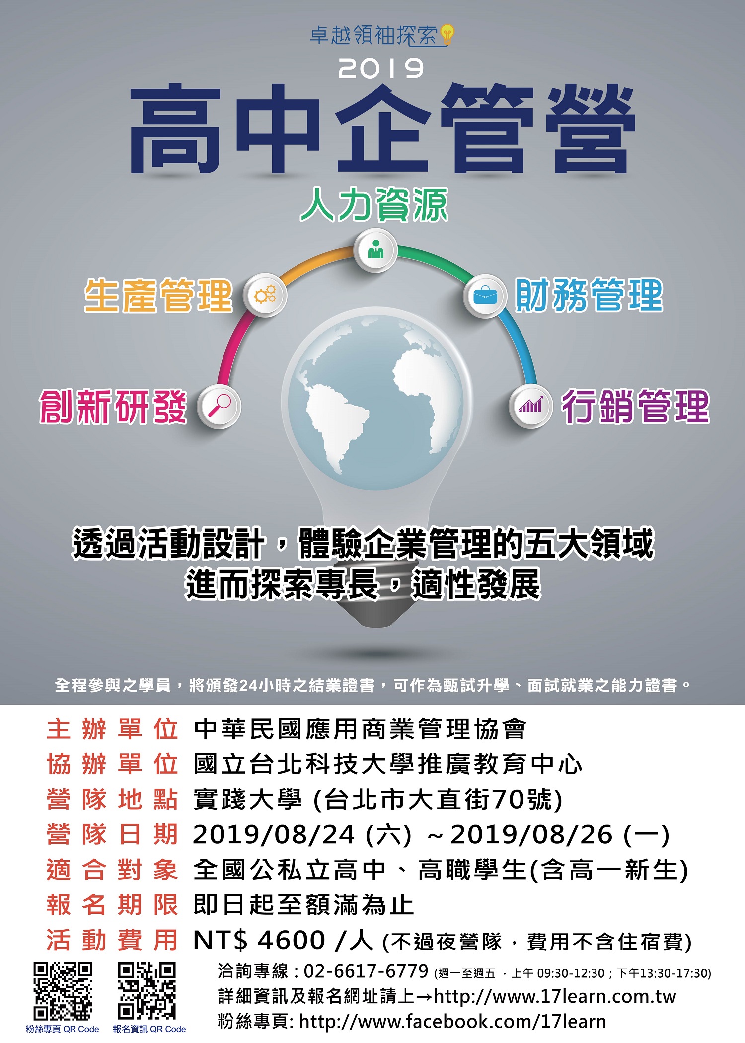 一、營隊名稱: 卓越領袖探索系列 -「高中企管營」