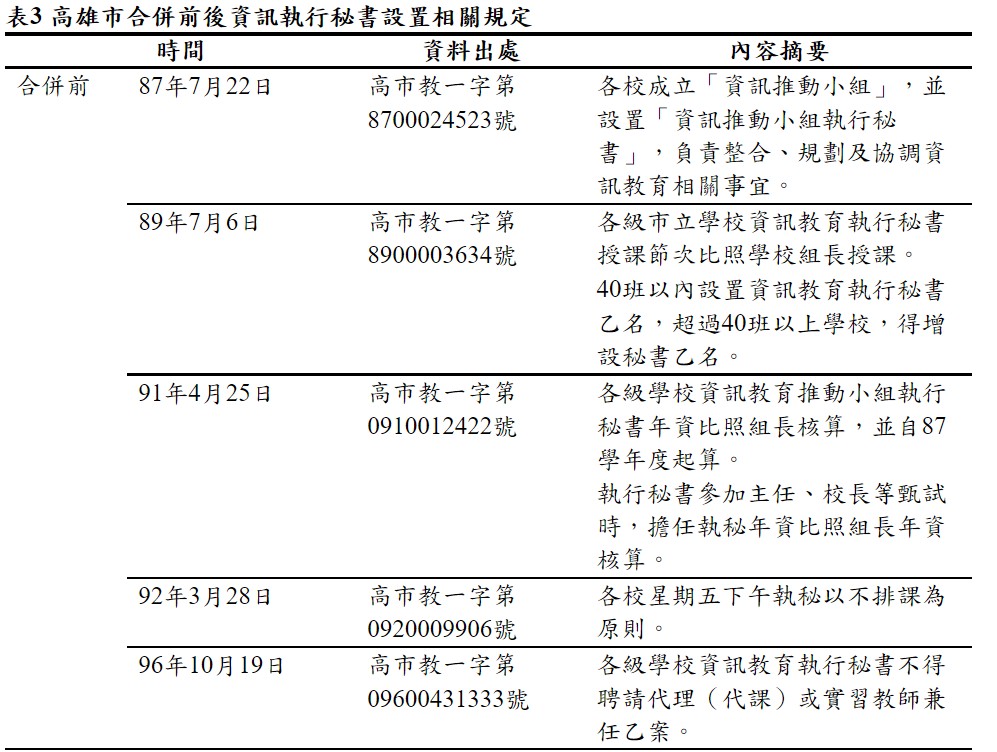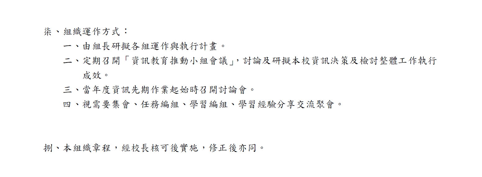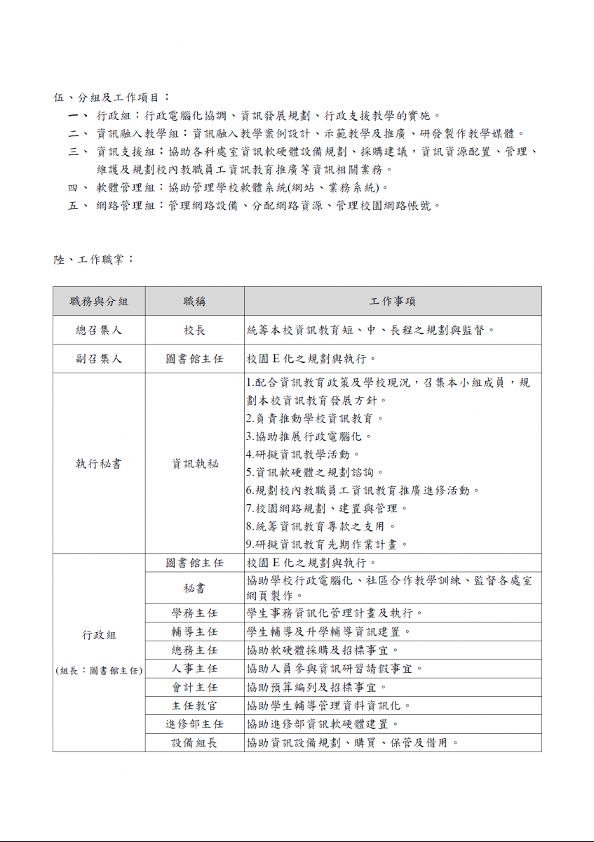 | 1.資訊教育推動小組設立辦法暨相關職掌 2.重申本局所屬各級學校各項資訊人員職稱公文-附件 3.執秘比照組長年資公文 4.執秘減授課規定公文 5.修正5高雄市高級中等學校教師及兼任行政職務人員每週授課節數實施要點第五點附件 6.參考資料一、參考資料二 |