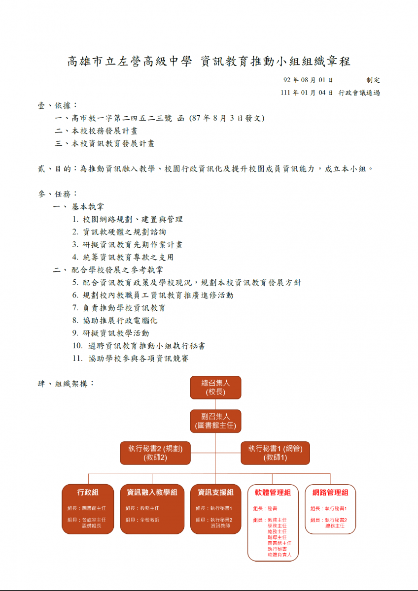 高雄市立左營高級中學資訊教育推動小組組織章程 (92.8.1制定) (111.1.4修訂)
