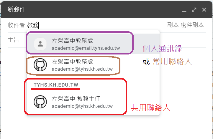 3.110年8月以後入學之新生,email網域為@tyhs.kh.edu.tw。