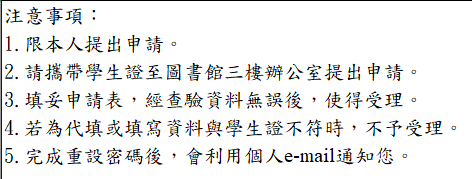 2.學生忘記密碼或欲修改個人資料時,請本人攜帶學生證至圖書館三樓辦公室,親自辦理申請重設密碼與修改個人資料。(注意事項)